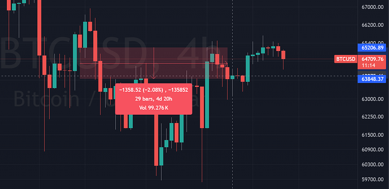 Despite anticipation for a significant rally following the halving, bitcoin investors were met with disappointment as the week ended on a slightly bearish note, with the asset slipping 2% to close the Friday daily candle near $63,850, down from an opening of $65,200.