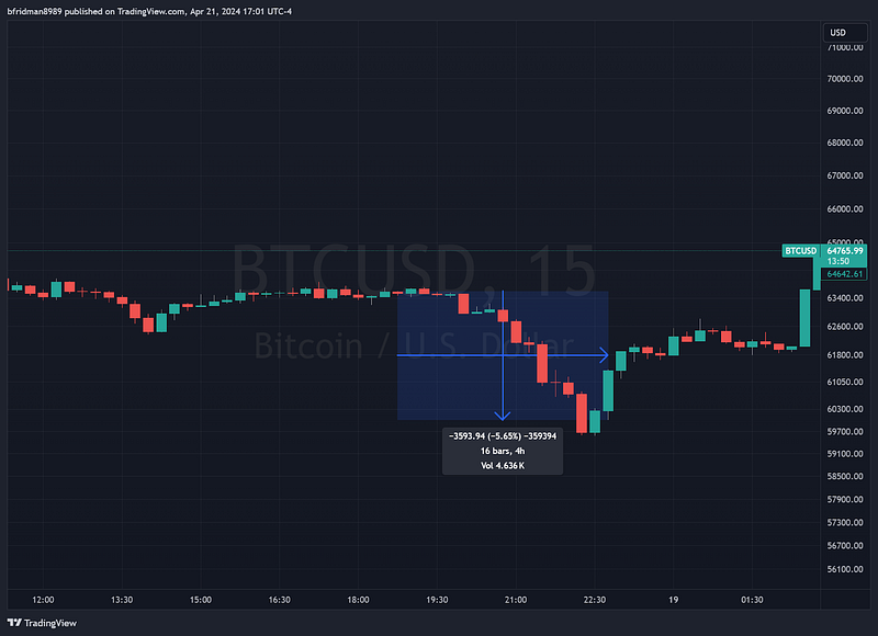 The world held its breath as Israel contemplated its response to Iran’s previous weekend attack. Uncertainty loomed regarding the timing and magnitude of retaliation and how global powers would perceive such actions. Early Friday saw market turbulence as Israel targeted multiple military sites, causing bitcoin to plummet from a pre-market high of $63,500 to dip below the critical $60,000 support briefly, hitting a low of around $59,600 — a staggering $3500 or -5.5% drop within an hour.