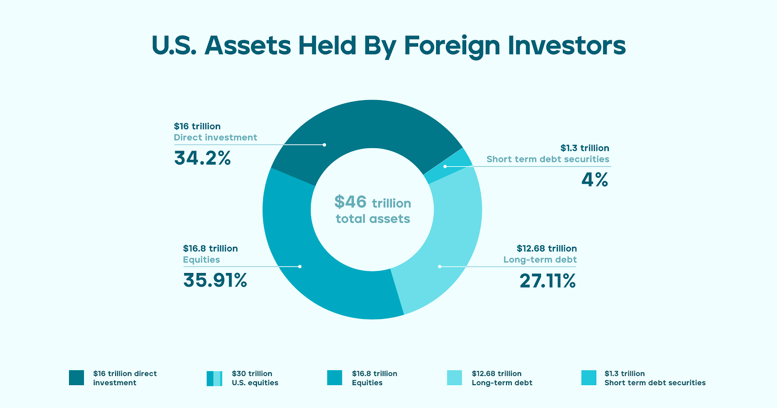Now, roughly $46 trillion in U.S. assets, comprising $16 trillion in direct investment and $30 trillion of U.S. Securities (equities, long-term debt, etc.), are held by foreign investors.